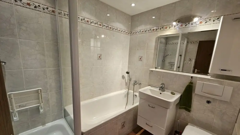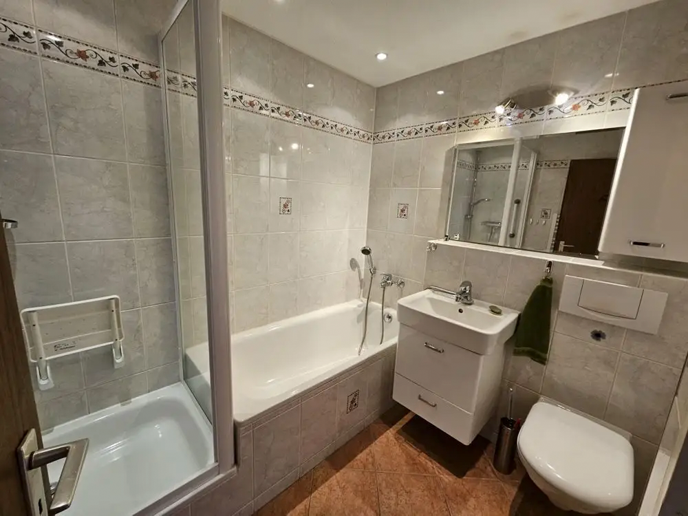 Das Badezimmer bietet mit Badewanne und separater Dusche viel Komfort, zusätzlich gibt es ein separates Gäste-WC.