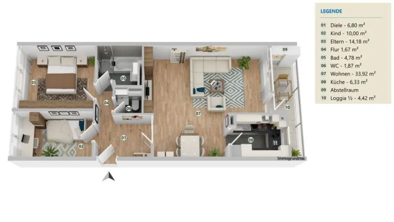 Die in dem Grundriss eingezeichnete Möblierung ist im Lieferumfang nicht enthalten und nicht Vertragsbestandteil.
